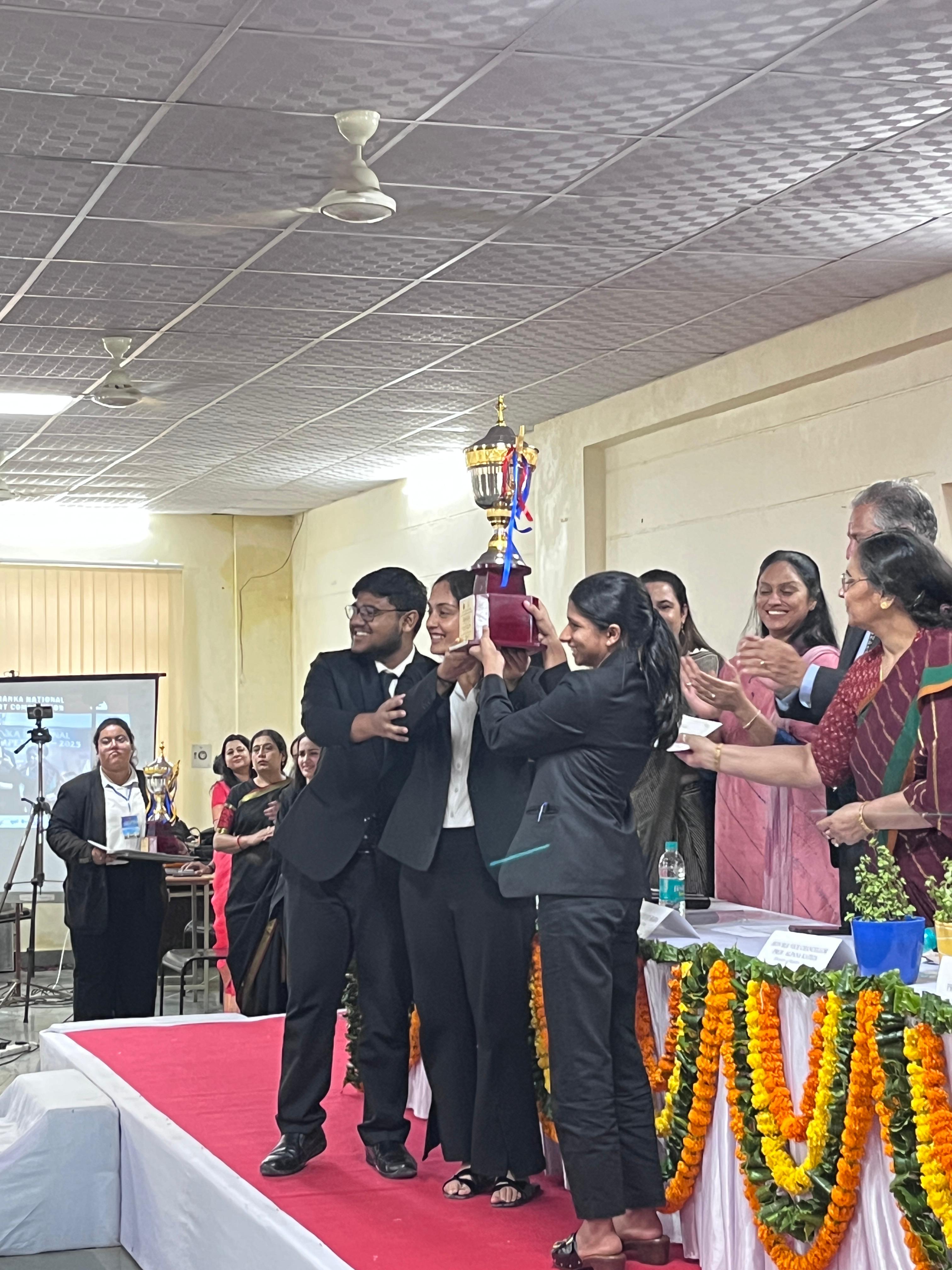 The Moot Court team, consisting of Rakshithashree MR, Adi Biswas and Bhumika Rai, secured first place at the 13th UFYLC Ranka International Moot Court Competition. They competed with 70 teams and emerged victorious.