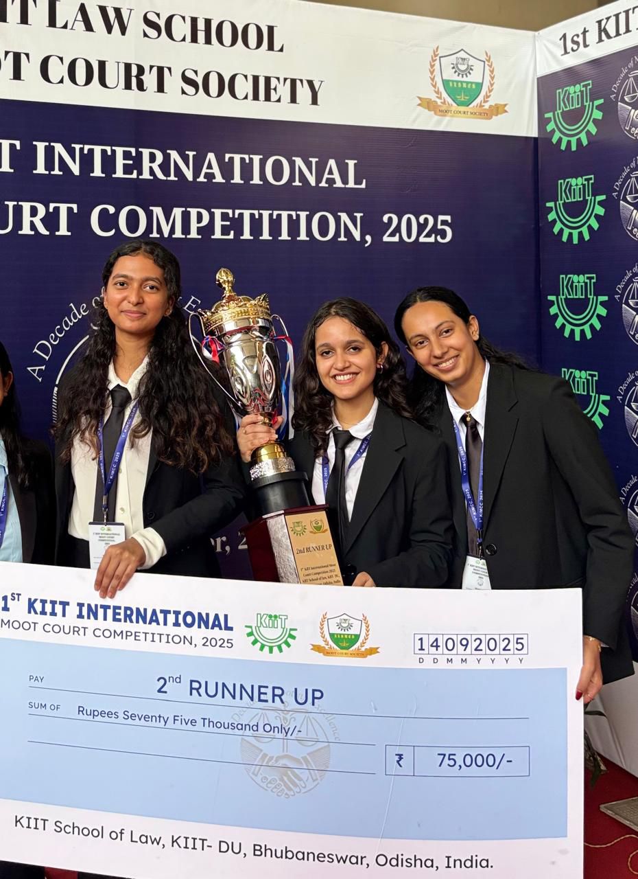 The Moot Court team, consisting of Tanmayee Vellore Raghunandan, Sreenidhi M, and Gayatri Vijay Pai, secured the runners-up position at the 1st KIIT International Moot Court Competition. They competed with 54 teams.