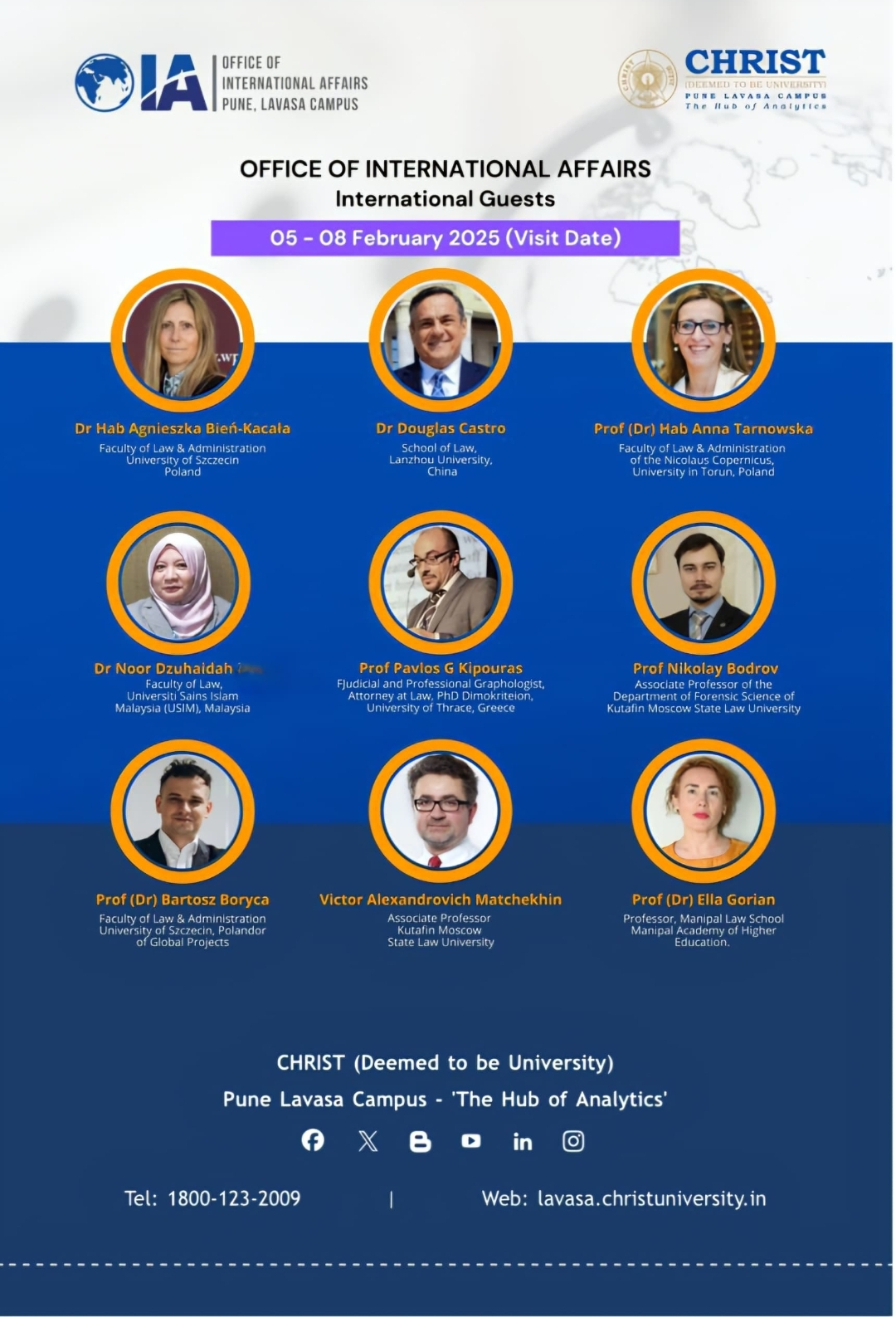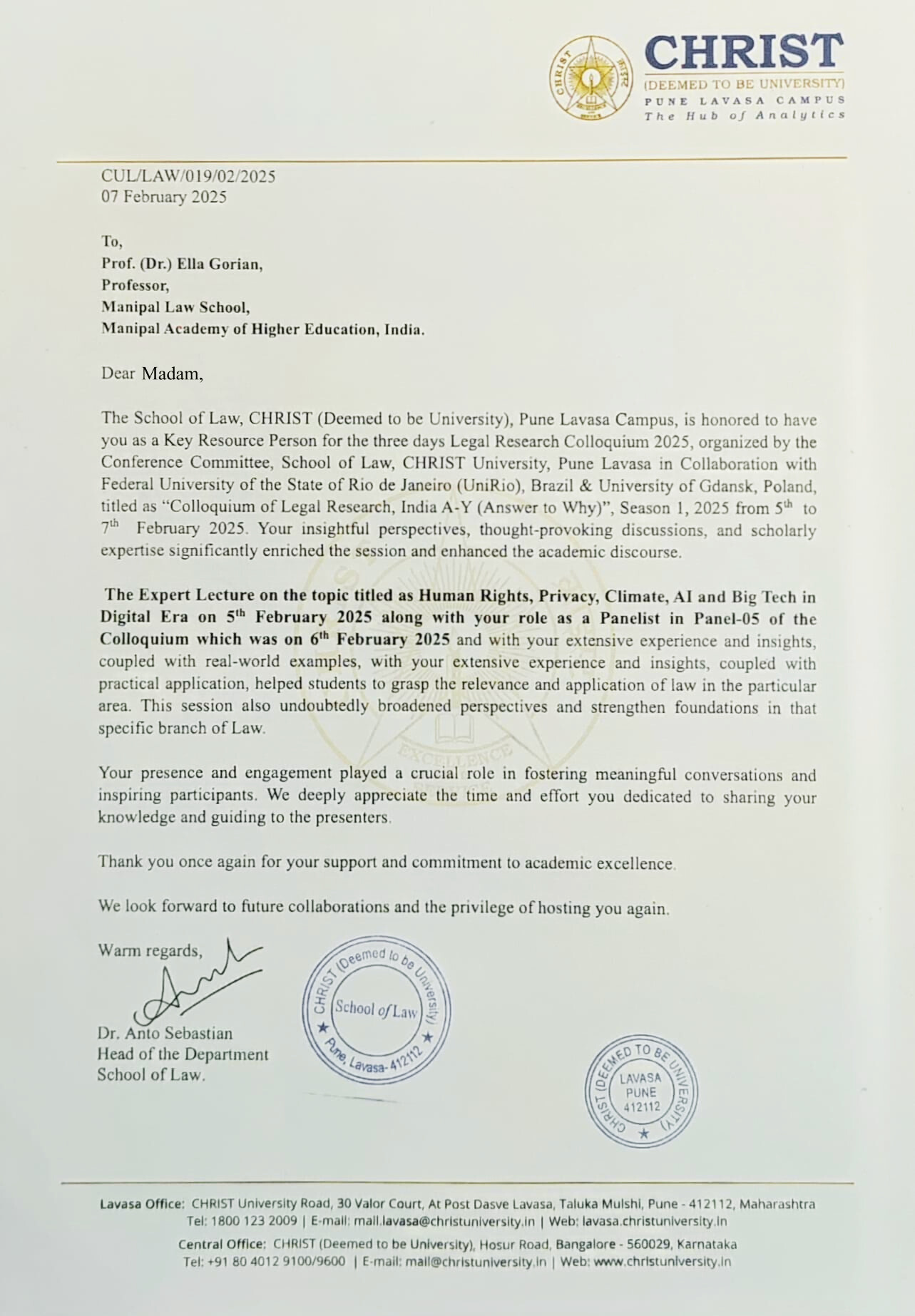 Professor Dr. Ella Gorian chaired the panel session "Forensics and Criminal Law" at the International Colloquium of Legal Research, India A-Y (Answer to Why), Season 1, 2025. This prestigious event was organized by the School of Law, CHRIST (Deemed to be University) Pune Lavasa Campus in collaboration with the Federal University of the State of Rio de Janeiro (UniRio), Brazil, and the University of Gdansk, Poland.