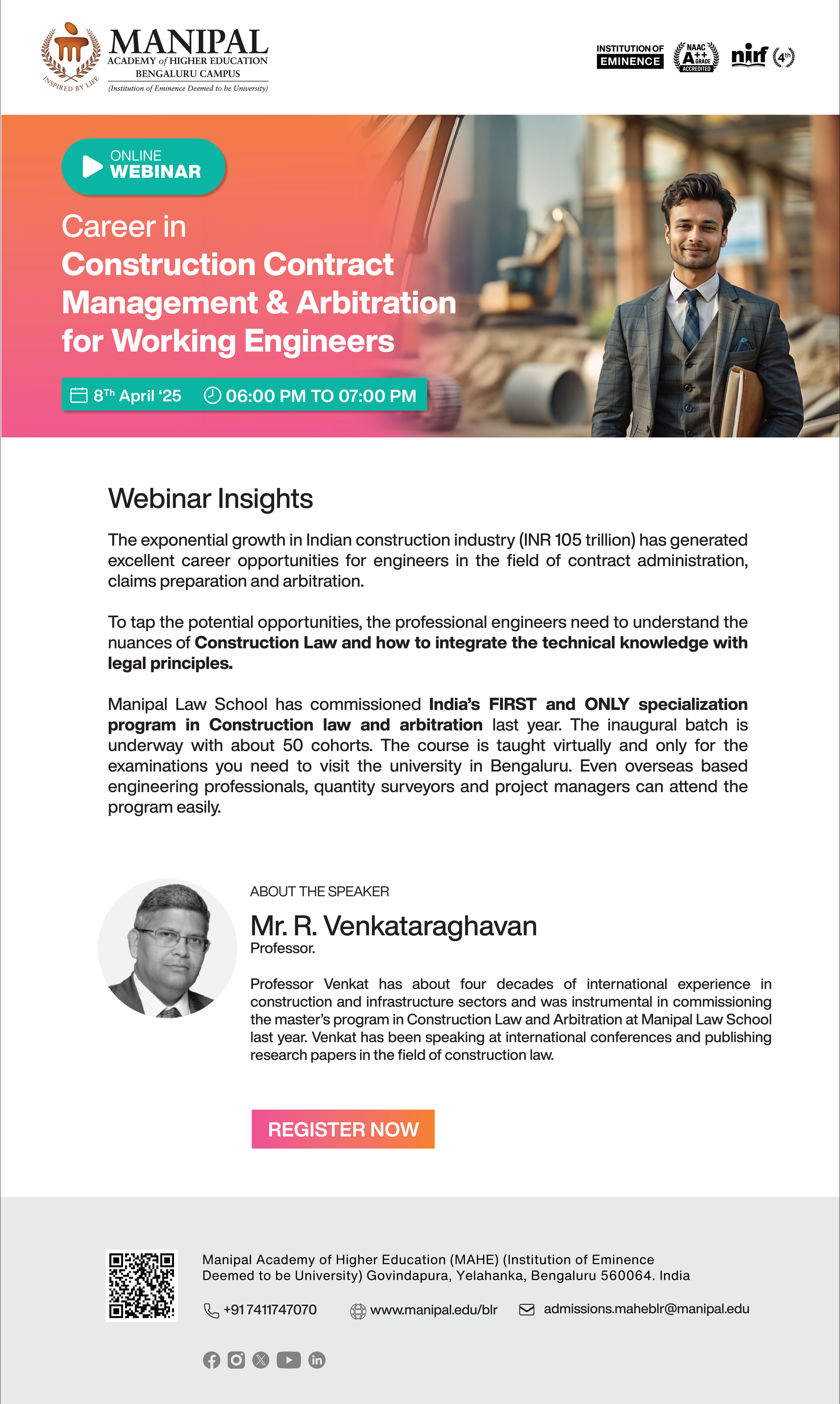 The legal landscape of the construction industry is evolving rapidly, creating exciting career opportunities for legal professionals. Join Prof. Venkataraghavan Ramadurai, Manipal Law School, Bengaluru, MAHE- Bengaluru to explore the diverse career paths for aspiring legal professionals.