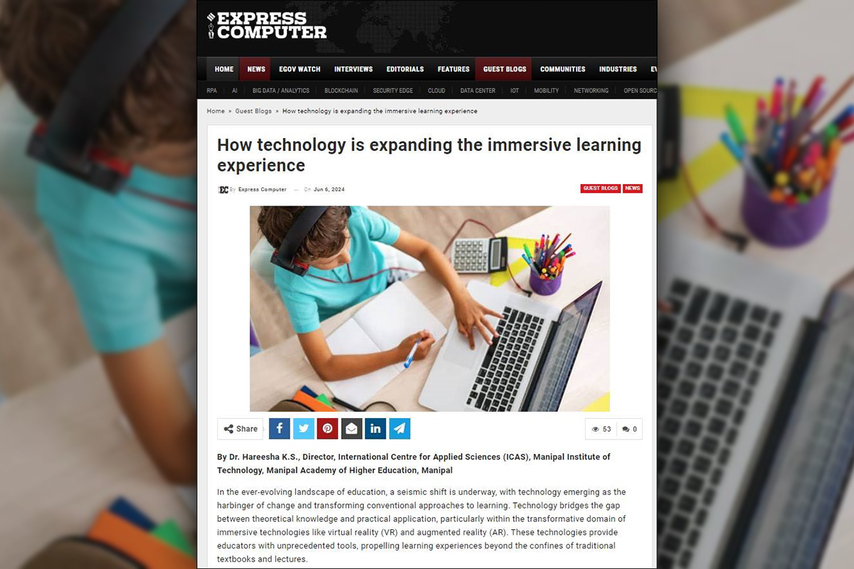 Manipal; June 6th 2024: The author's article, How technology is expanding the immersive learning experience, by Dr Hareesha K.S., Director, International Centre for Applied Sciences (ICAS), MIT, Manipal.