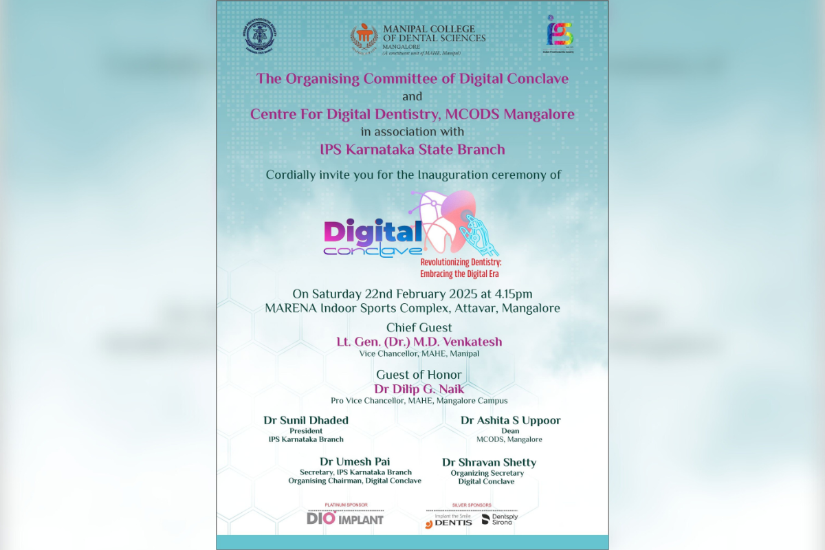 The Organising Committee of the Digital Conclave and the Centre for Digital Dentistry, MCODS Mangalore, in association with the IPS Karnataka State Branch, is set to host the Digital Conclave 2025 on 22nd February 2025. The event will take place at MERENA Indoor Sports Complex, Attavar, Mangalore.