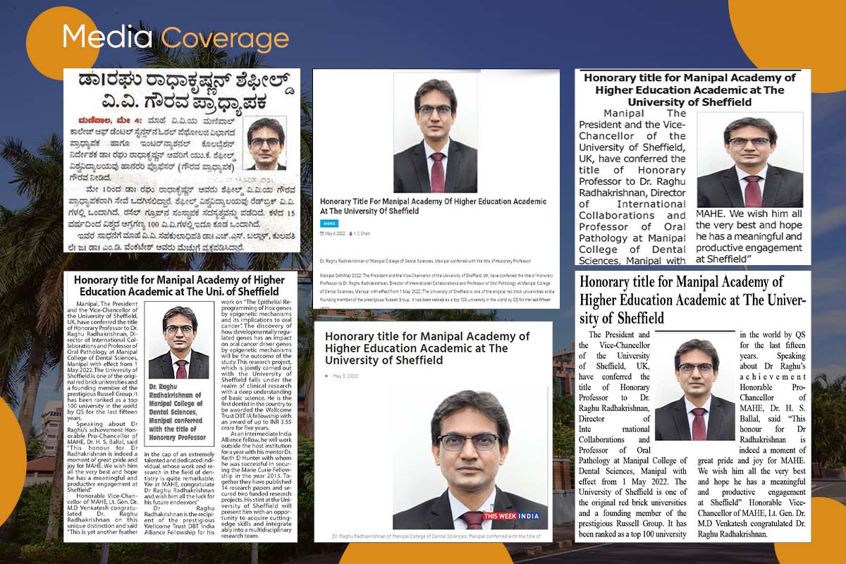 Manipal, 06th May 2022: The President and the Vice Chancellor of the University of Sheffield, UK, have conferred the title of Honorary Professor to Dr. Raghu Radhakrishnan, Director of International Collaborations and Professor of Oral Pathology at Manipal College of Dental Sciences, Manipal with effect from 1 May 2022. The University of Sheffield is one of the original red brick universities and a founding member of the prestigious Russell Group. It has been ranked as a top 100 university in the world by QS for the last fifteen years.