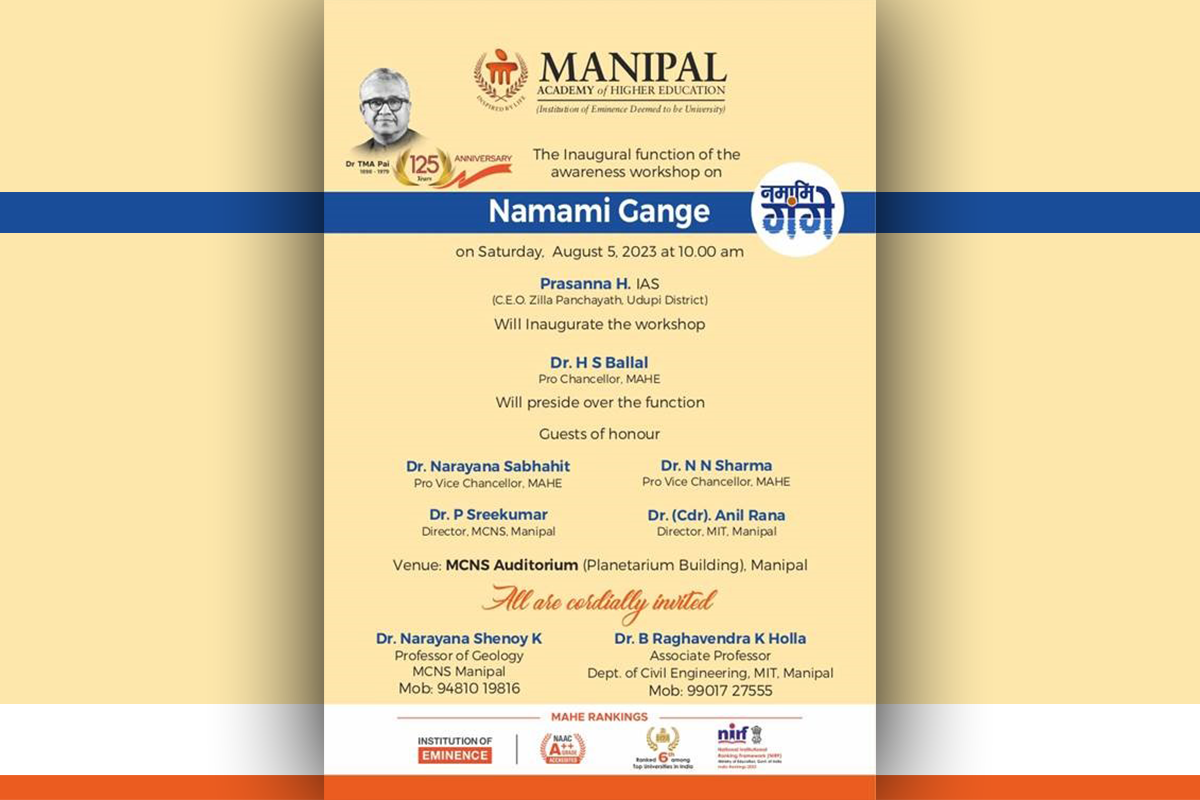 The inaugural function of the Namami Gange workshop will be held on 05th August 2023; Mr Prasanna H. IAS (C.E.O. Zilla Panchyanth Udupi District) will inaugurate the workshop. The function will be presided over by Dr H.S. Ballal, Pro Chancellor, MAHE, Manipal. And will be attended by a host of dignitaries such as Dr Narayana Sabhahit, Pro Vice Chancellor, Technology & Science; Dr N N Sharma, Pro Vice Chancellor, Strategy & Planning; Dr P Sreekumar, Director MCNS, Manipal & Dr (Cdr). Anil Rana, Director, MIT Manipal.