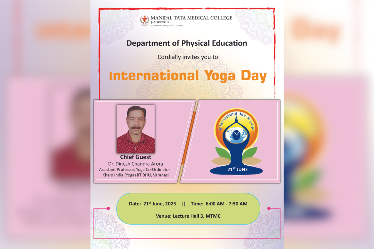 The Manipal - TATA Medical College, Jamshedpur, will celebrate International Day of Yoga on 21st June 2023, a day dedicated to promoting holistic well-being and yoga practice. The yoga session will be conducted by a certified yoga expert Dr. Dinesh Chandra Arora, Yoga Coordinator Khelo India and IIT, Banaras Hindu University, Varanasi.