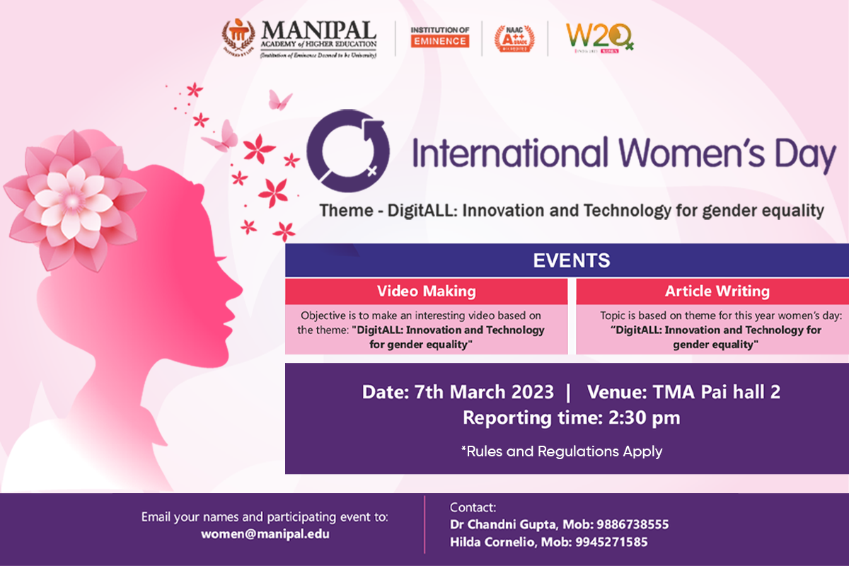The Manipal Academy of Higher Education (MAHE), Manipal, will be celebrating International Women's Day. This year International Women's Day is scheduled for 8th March 2023. The theme for 2023 will be "DigitALL: Innovation and technology for gender equality".