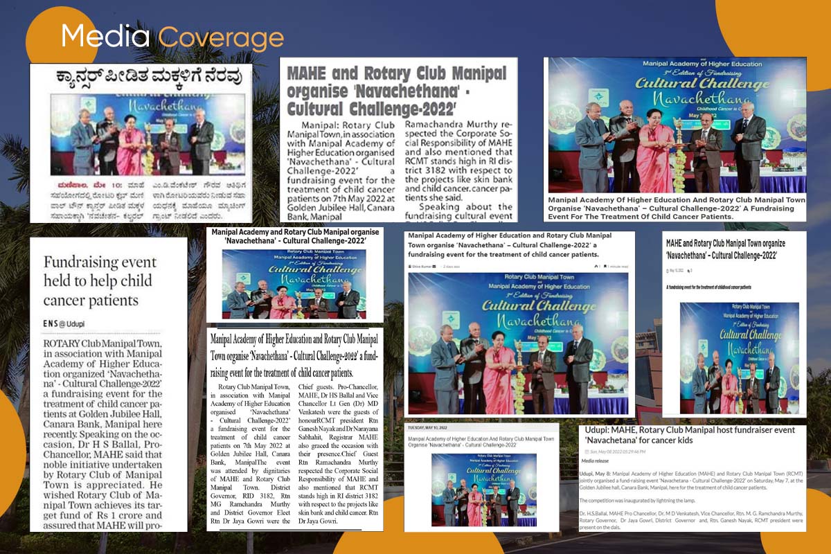Manipal, 12th May 2022: Rotary Club Manipal Town, in association with Manipal Academy of Higher Education, organized 'Navachethana' - Cultural Challenge-2022’ a fundraising event for the treatment of child cancer patients on 7th May 2022 at Golden Jubilee Hall, Canara Bank, Manipal