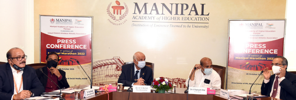 Manipal 26th September 2021- Manipal Academy of Higher Education in association with Udupi district Amateur Athletic Association has decided to hold the 5th edition of Manipal Marathon that is MM 2022, on 13th February 2022. The announcement was made in the pre-event press conference today MAHE’s University building in the presence of Shri. Raghupathi Bhat, MLA of Udupi and President - Udupi district Amateur Athletic Association and Dr H S Ballal, Pro-Chancellor, MAHE, Dr Narayana Sabhahit, Registrar of MAHE, Mr. S P Kar, Director, PR, Media & Social Media Cell, MAHE along with Dr Vinod Nayak, Secretary, Sports Council, MAHE.
