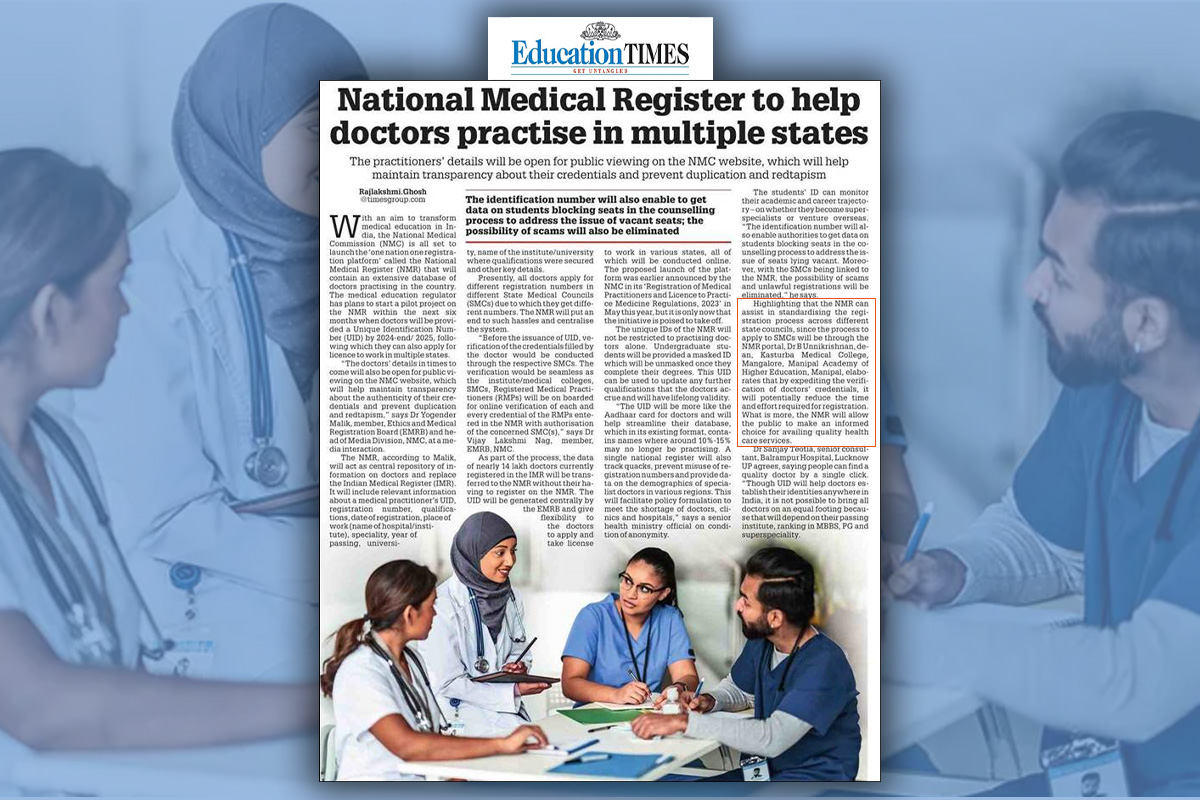 Manipal, 6th November 2023 – In the article "National Medical Register to help doctors practice in multiple states", valuable insights are given by Dr B. Unnikrishnan, Dean & Professor of Community Medicine, Kasturba Medical College (KMC), Mangalore.