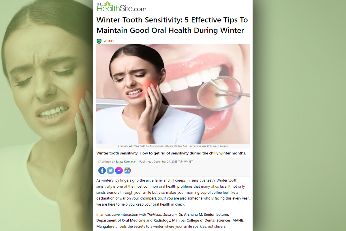 Manipal, 24 December 2023: The author's article, "Winter Tooth Sensitivity: 5 Effective Tips To Maintain Good Oral Health During Winter", by Dr Archana M, Senior lecturer, Department of Oral Medicine and Radiology, Manipal College of Dental Sciences (MCODS), Mangalore.