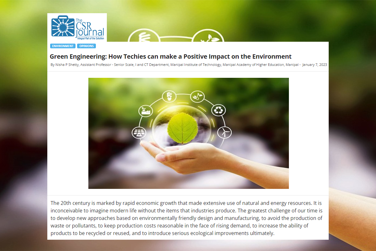 Manipal, 07th January 2023: The author’s article, “Green Engineering: How Techies can make a Positive Impact on the Environment”, by Nisha P Shetty, Assistant Professor - Senior Scale, I and CT Department, Manipal Institute of Technology (MIT), Manipal.