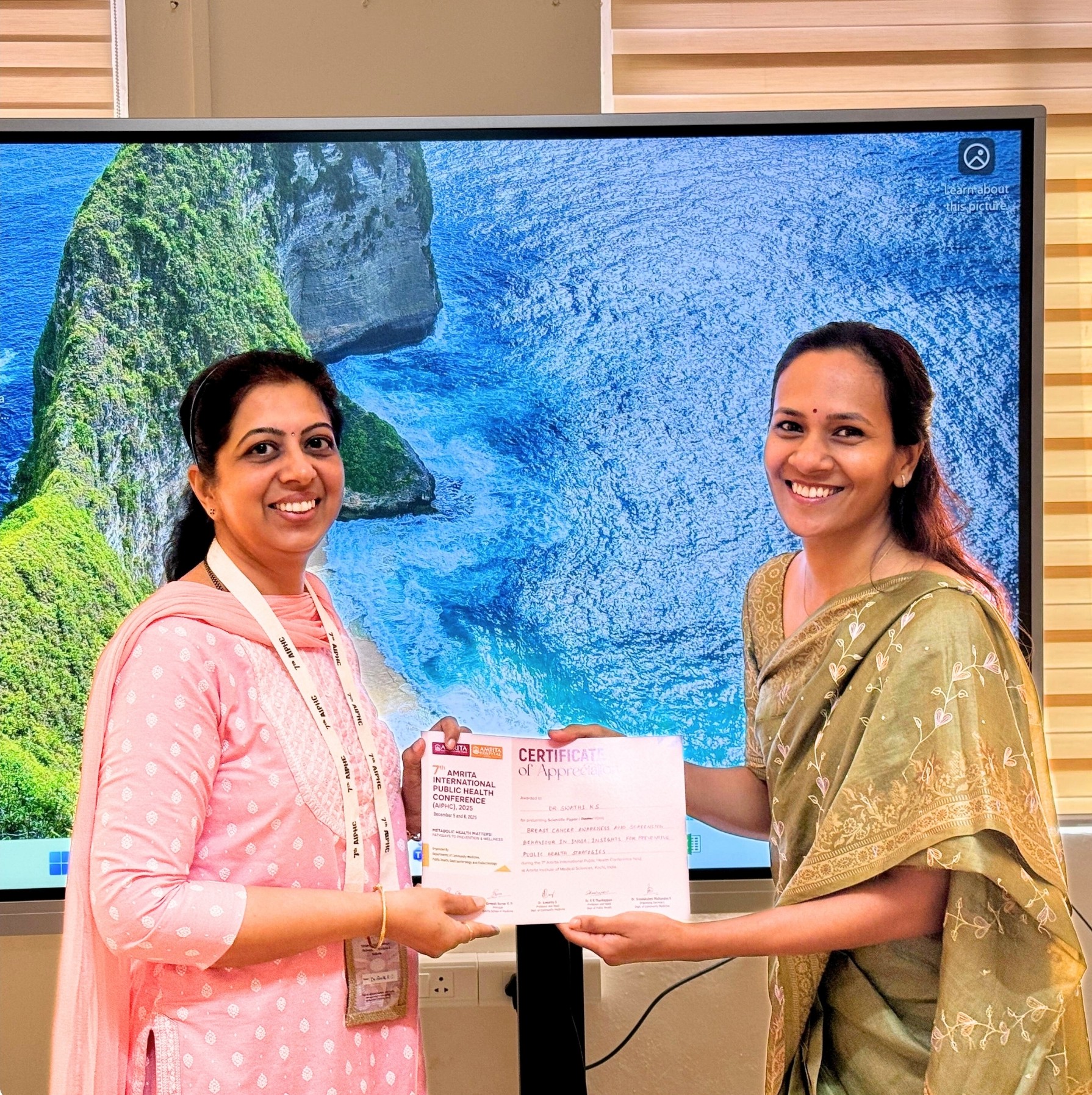Dr Swathi K S (Department of Healthcare and Hospital Management, PSPH, Manipal) received the Promising Paper Award for the scientific paper titled "Breast Cancer Awareness and Screening Behaviour in India: Insights for Preventive Public Health Strategies" at the 7th Amrita International Public Health Conference 2025, held on December 5-6, 2025, at the Amrita Institute of Medical Sciences, Kochi, Kerala.