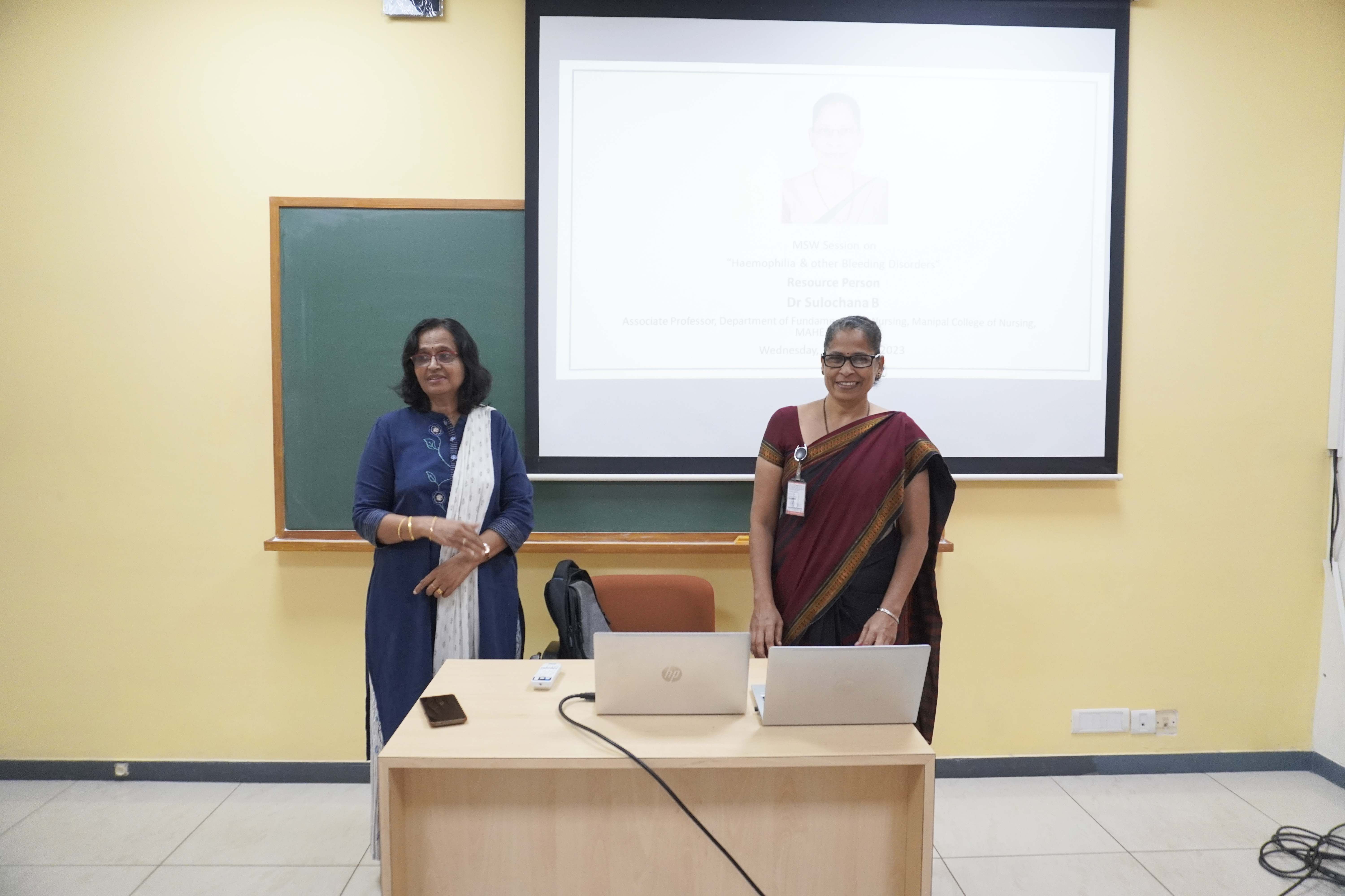 Dr Sulochana B, Associate Professor, Department of Fundamentals of Nursing, MCON, MAHE, Manipal spoke about spoke regarding haemophilia; bleeding disorders; clotting of blood; blood; platelets, plasma; how haemophilia, bleeding disorders occur in people; the causes, preventive measures, treatment-medicine regarding these; what can be done to help people having haemophilia/bleeding disorders; how the family, friends, acquaintances of such people can help them to live a happy, peaceful life. The talk was organised by MSW Programme, Dpt SHI, PSPH.