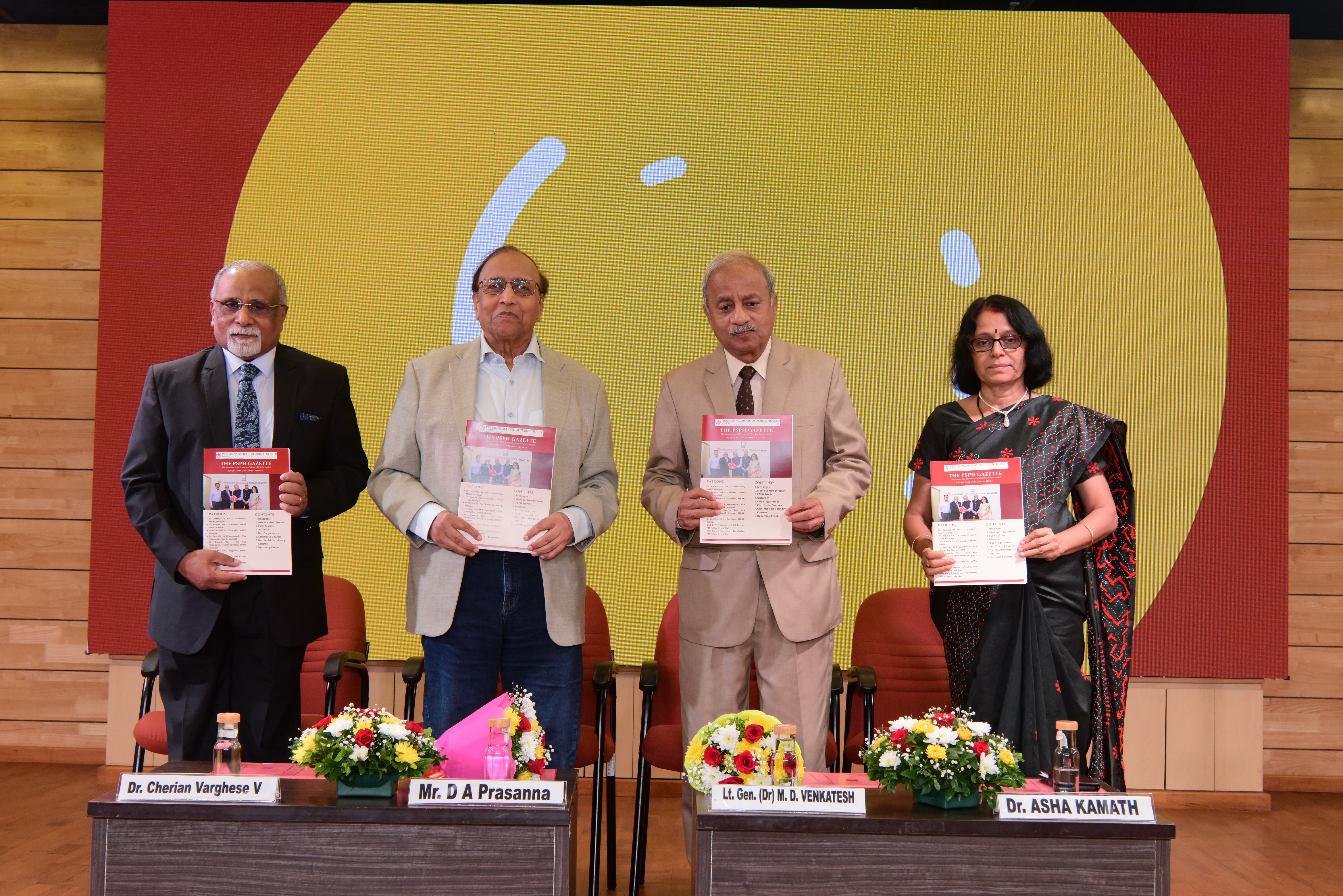 Lt. Gen. (Dr.) M. D. Venkatesh, Vice Chancellor of MAHE, released the first edition of PSPH Gazette - The PSPH Newsletter and in his Presidential Address underscored the importance of problem-solving, critical thinking, and interdisciplinary collaboration. He emphasized the key verticals of excellence in education, exemplary research, internationalization, sustainability, and alumni engagement. Highlighting the integral role of research, He advocated for a proactive rather than reactive stance in addressing the enormity of public health problems. He remarked, "Excellence is achieved by consistently performing, and PSPH stands by this principle." Additionally, he shared his perspective on the quantum of education, stating, "25% of education is derived through teachers, 25% from one's own willingness, 25% from peers, and the rest as a lifelong learner."