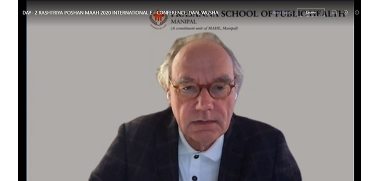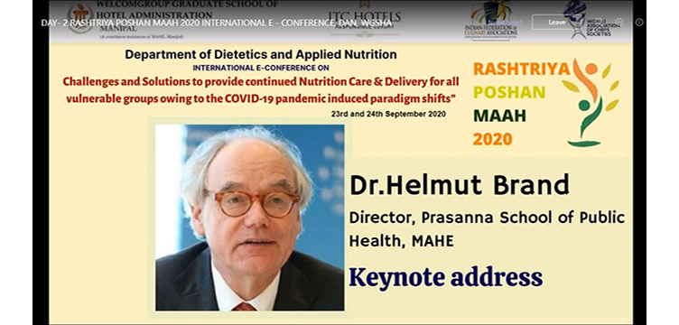 The month of September 2020 has been declared by the Government of India as the “Rashtriya Poshan Maah” / National Nutrition Month. The Department of Dietetics and Applied Nutrition, Welcomgroup Graduate School of Hotel Administration (WGSHA), MAHE, Manipal had Organized an International E-Conference on Nutrition based on the topic “Challenges and Solutions to provide continued Nutrition Care & Delivery for all Vulnerable groups owing to the COVID-19 Pandemic induced paradigm shifts” on September 23 and 24, 2020 through Microsoft Teams. Prof. Dr. Helmut Brand (Director, PSPH, MAHE, Manipal) was the Keynote Speaker on September 24, 2020.