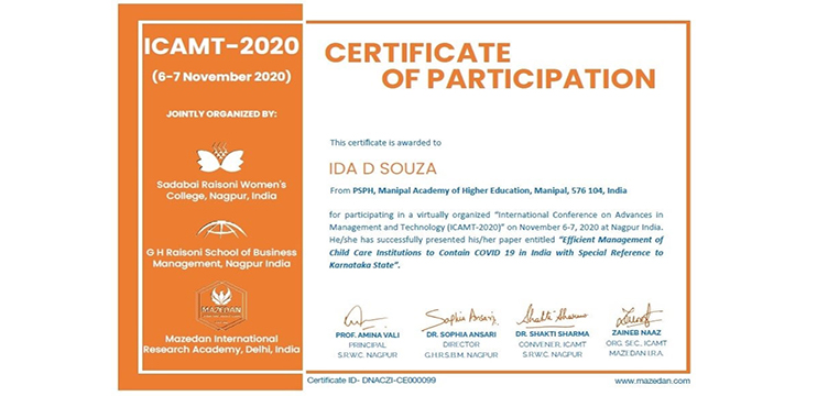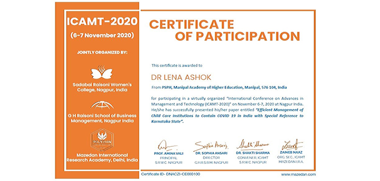 Dr Lena Ashok (Coordinator, MSW Program) and Ms Ida Dsouza (Faculty, MSW Program) presented their research on “Efficient Management of Child Care Institutions to contain COVID 19 in India with special reference to Karnataka state” in the International e-Conference on Advances in Management and Technology (ICAMT-2020) jointly organized by Sadabai Raisoni Women’s College, G H Raisoni School of Business Management and Mazedan International Research Academy during November 6-7, 2020.