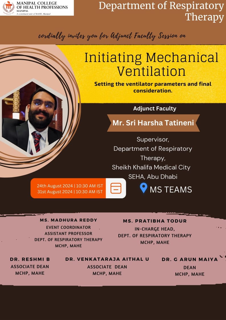 The Department of Respiratory Therapy conducted an online adjunct faculty webinar session on the topic of Initiation of Mechanical ventilation. The adjunct faculty for the session was MR. Sri Harsha Tatineni, Supervisor of Respiratory Therapy Department, SEHA, Abudabi. It was a two-day session conducted on MS Teams on the 24th and 31st of August 2024, where students not only from MCHP but also from other institutes attended. Various alumni of the Respiratory therapy department also attended the session. The session gave insights on the indications for mechanical ventilation and how to set up a mechanical ventilator in a Critical Care Setup.