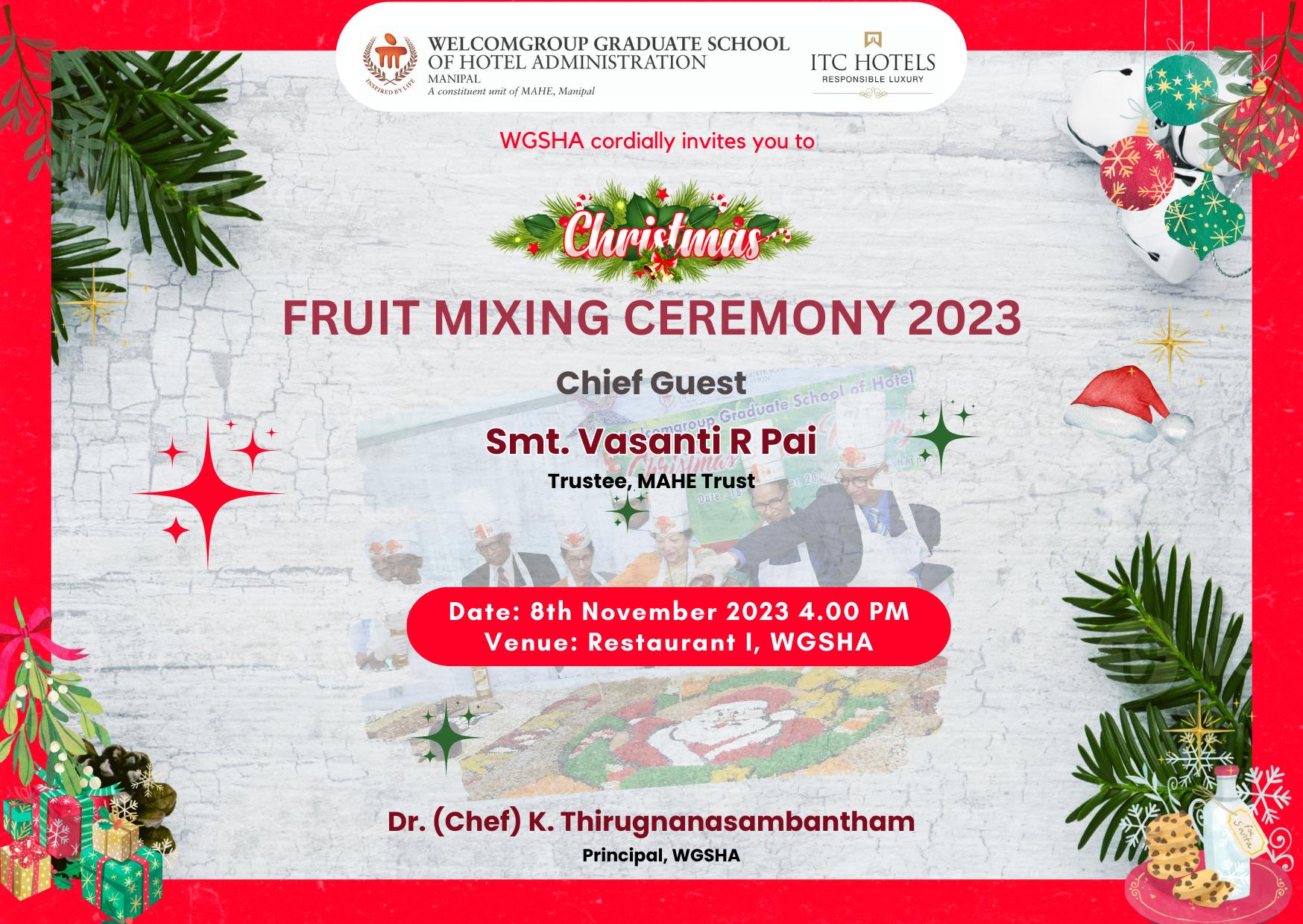 Welcomgroup Graduate School of Hotel Administration (WGSHA) is all set for the grand fruit-mixing ceremony on the 8th of November 2023. Smt. Vasanti R Pai, first lady of MAHE will be the Chief Guest.