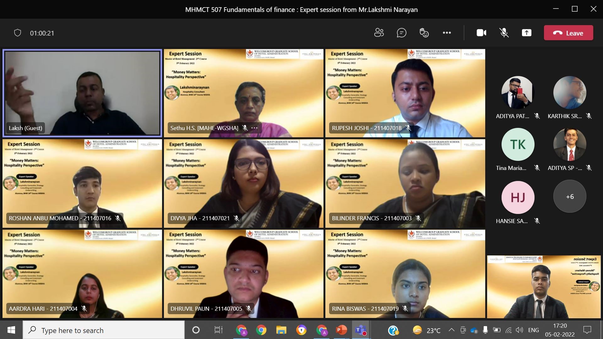 WGSHA Manipal FEB 05, 2022: The expert session on “Money Matters: Hospitality Perspective” was arranged for the students of WGSHA to learn about the rising usefulness and importance of finance in the hospitality Industry. The guest speaker was Mr. Lakshminarayan Srinivasan, who is an alumnus of WGSHA’s 14th course BHM. Mr. Lakshminarayan talked about the history of hospitality and the evolution of the industry. The students of 2nd course MHM got insights about tech-enabled hospitality platforms and hospitality investments. Mr. Lakshminarayan explained aspects of the time value of money and the effects of economic conditions on hospitality sector. The students learned financial analysis techniques from a hands-on expert, Mr. Lakshminarayan.