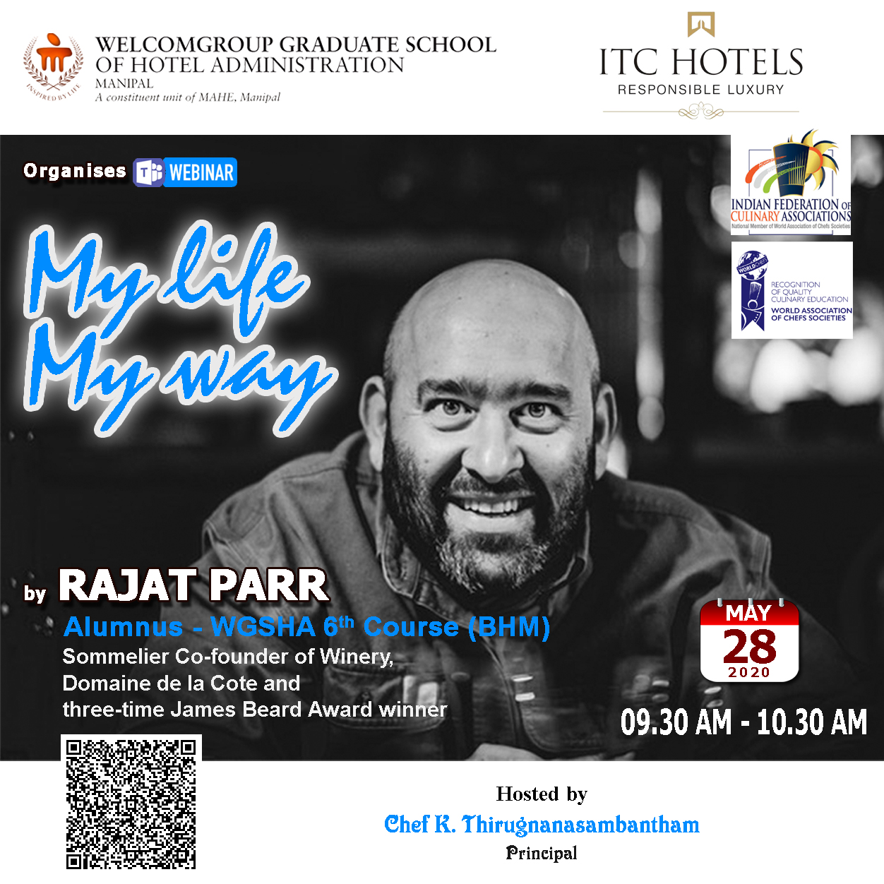 On 28th May, 2020 a webinar was conducted with Mr. Rajat Parr for all the students of WGSHA. The webinar session was a part on the ongoing FAST program initiated by our principal Chef Thiru, in March, 2020.